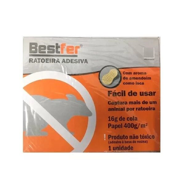 Ratoeira adesiva com cola, desenvolvida para capturar roedores de forma prática, sem o uso de venenos. Produzida em papel 400g/m² com 16g de cola adesiva, possui aroma de amendoim que funciona como isca atrativa, aumentando a eficiência da captura.Com tamanho aberto de 22,5 cm x 35 cm, sua área permite capturar mais de um animal por unidade. Produto de uso único, ideal para ambientes residenciais, comerciais ou industriais.